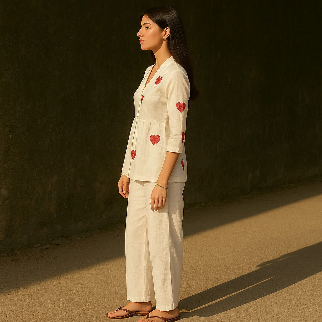 Playful yet refined, this linen embroidered co-ord set brings charm and comfort together in perfect harmony. Crafted from soft, breathable linen, the ivory-hued ensemble features a relaxed-fit top adorned with delicate red heart embroidery, adding a touch of whimsy to its classic silhouette. The V-neckline and three-quarter sleeves lend it an effortlessly chic appeal, while the wide-leg pants ensure all-day comfort and ease.