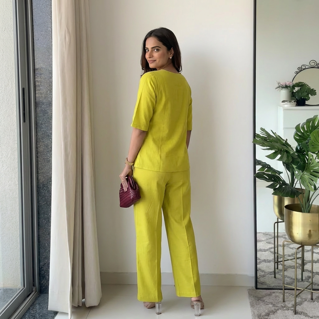 Savor the carefree days of summer in our Lime Green Pleated Top and Wide Leg Pants set. Perfect for casual outings, daily wear, and summer vacations. Made from soft, breathable cotton for ultimate comfort. Embrace the warm weather in this effortlessly stylish and versatile ensemble.