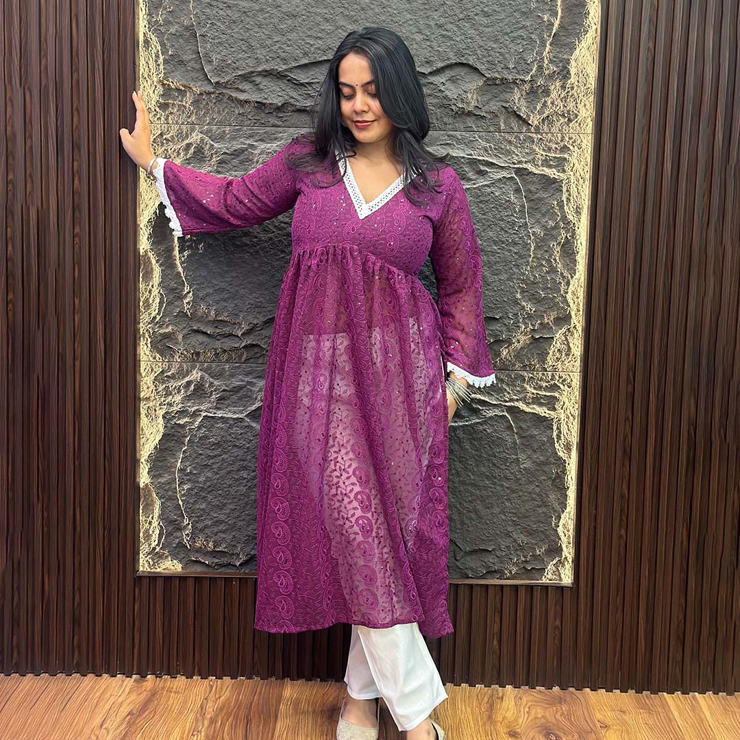 Expertly crafted with Alia-Cut Georgette fabric, this Lucknowi Chikankari Kurta Set is a must-have for any fashion-forward individual. The intricate craftsmanship of the Alia-Cut Georgette adds a touch of elegance and sophistication, making this set a perfect addition to your wardrobe. Experience the comfort and style of this unique piece.